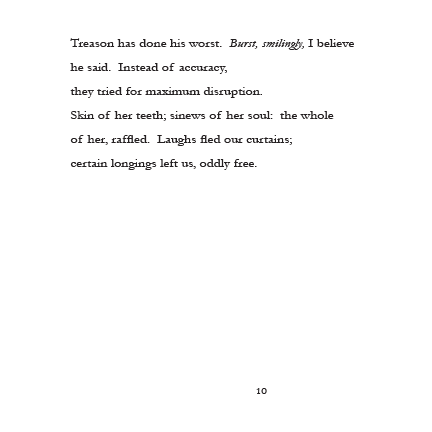 There are moments of 17th Century diction in these poems – “'Twould have engaged my heart” – which mix with the contemporary demotic – “Slip into your pj's”. This picante blending presents a discourse – the poems are structured to tell a story or explain something – which is elliptical, and thus the meaningful and emotive sense of them is considerably enriched. In fact, the “poetry”, or beauty, of these works resides in those empty spaces, which are not empty at all, but filled with the possibilities that make them worth reading repeatedly.